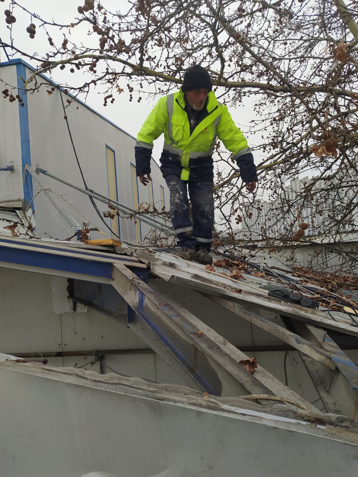 Demontaj sürecinde, özellikle çatı oluklarında meydana gelen tıkanıklıklar, su birikmeleri ve malzeme çürümeleri dikkatle ele alınmıştır. Bu işlemler sırasında iş güvenliği kurallarına azami önem verilmiş, uzman ekibimiz tarafından kontrollü bir şekilde söküm yapılmıştır. Çatı panelleri, oluk bağlantıları ve taşıyıcı konstrüksiyon unsurları zarar görmeden ayrıştırılarak sahadan uzaklaştırılmıştır.